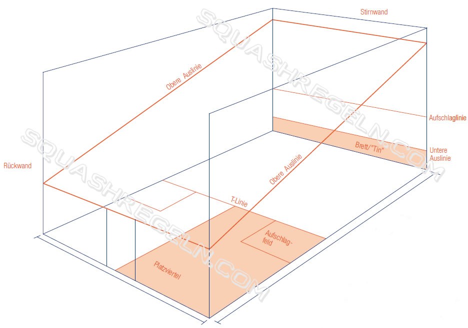 Das Spielfeld ist durch die obere farbige Linie markiert, wobei die Linien schon zum Spielaus gehören. Das Aus beinhaltet ebenfalls das Brett (auch „Tin“ genannt).